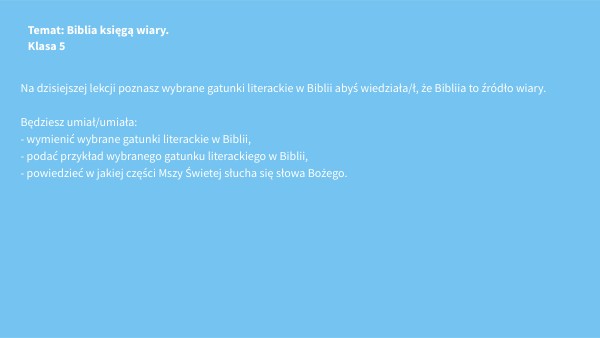 Na dzisiejszej lekcji poznasz wybrane gatunki literackie w Biblii abyś wiedziała/ł, że Bibliia to źródło wiary. Będziesz umiał/umiała: - wymienić wybrane gatunki literackie w Biblii, - podać przykład wybranego gatunku literackiego w Biblii, - powiedzieć w jakiej części Mszy Świetej słucha się słowa Bożego.