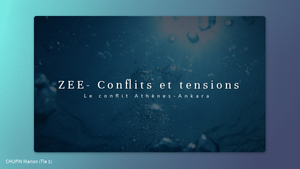 Conlusion:Les ZEE, espaces maritimes aux nombreuses ressources tant énergétiques qu'halieutiques sont devenues les nouveaux enjeux de puissance internationales. En effet, nous avons vu à travers cet exemple de conflit greco-Turque, que le découpage de ces zones, encore incomplet et très contesté sont sources de véritables tensions voire conflits qui menacent parfois l'équilibre international et la paix. Si les liaisons entre ces deux pays semblent s'être apaisées, à la surface du globe, le sujet des ZEE divise encore cetains pays ...