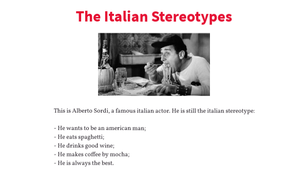 This is Alberto Sordi, a famous italian actor. He is still the italian stereotype: - He wants to be an american man; - He eats spaghetti; - He drinks good wine; - He makes coffee by mocha; - He is always the best.