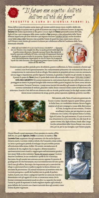 Diversi filosofi e poeti espressero il loro pensiero in merito all'Età dell'Oro, tra questi: Epicuro, Ovidio e Lucrezio. In merito a Tito Lucrezio Caro, sappiamo che egli sosteneva ciò che anche Epicuro riteneva esatto. Lucrezio credeva infatti, che l'umanità avesse subito un lento e prolungato periodo di sviluppo che poi avrebbe portato all'evoluzione della stessa civilità. Gli uomini, necessitavano di condizioni di vita migliori che, in seguito a diversi tentativi e sperimentazioni sono riusciti a raggiungere esclusivamente grazie a loro stessi. Nello scritto intitolato "Storia del genere umano", l'autore descrive l'ambiente, le sue condizioni e quelle di chi vi lavorava. Racconta che gli uomini non avevano ancora appreso il concetto di guadagnarsi ciò che bravamano, ma si accontentavano di tutto quello che il caso gli offriva. Racconta che impararono poi a costruirsi dei rifugi e a procurarsi fuoco e pelli; in seguito la donna divenne uno strumeto di procrezione. Gli animali iniziarono ad emettere versi che Lucrezio paragona a quelli dei bambini non in grado di parlare. Inoltre, il poeta non riesce a spiegarsi il perchè un uomo sia riuscito a denominare tutti gli oggetti di cui era a conoscenza senza che lo facesse contemporaneamente qualcun altro. La capacità che rende l'uomo in grado di esprimesi in modo migliore rispetto agli animali, è stata definita da Lucrezio una chance naturale data agli uomini, come il dono di poter ragionare.