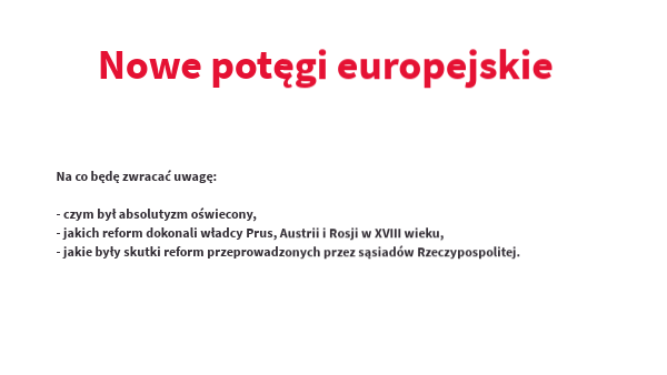 Na co będę zwracać uwagę: - czym był absolutyzm oświecony, - jakich reform dokonali władcy Prus, Austrii i Rosji w XVIII wieku, - jakie były skutki reform przeprowadzonych przez sąsiadów Rzeczypospolitej.