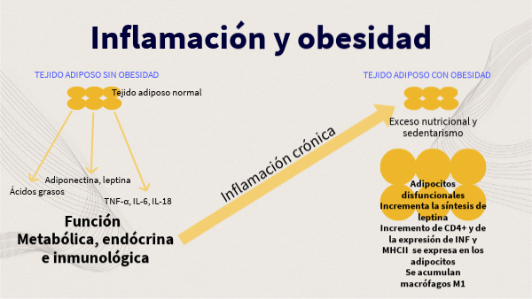 Adipocitos disfuncionales Incrementa la síntesis de leptina Incremento de CD4+ y de la expresión de INF γ MHCII se expresa en los adipocitos Se acumulan macrófagos M1