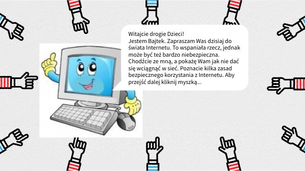 Witajcie drogie Dzieci! Jestem Bajtek. Zapraszam Was dzisiaj do świata Internetu. To wspaniała rzecz, jednak może być też bardzo niebezpieczna. Chodźcie ze mną, a pokażę Wam jak nie dać się wciągnąć w sieć. Poznacie kilka zasad bezpiecznego korzystania z Internetu. Aby przejść dalej kliknij myszką...