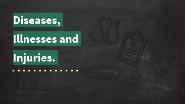 Make a mind map in your notebook. Try to think of as many examples of diseases, illnesses and injuries as you can. Write them down