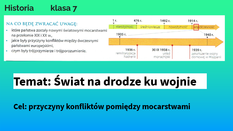 1. Światowe mocarstwa na przełomie XIX i XX wieku a) dotyczasowe - Wielka Brytania, Francja b) nowe mocarstwa: - Niemcy, - Stany Zjednoczone, - Japonia