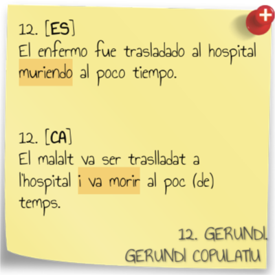 12. [ES] El enfermo fue trasladado al hospital muriendo al poco tiempo. 12. [CA] El malalt va ser traslladat a l'hospital i va morir al poc (de) temps.