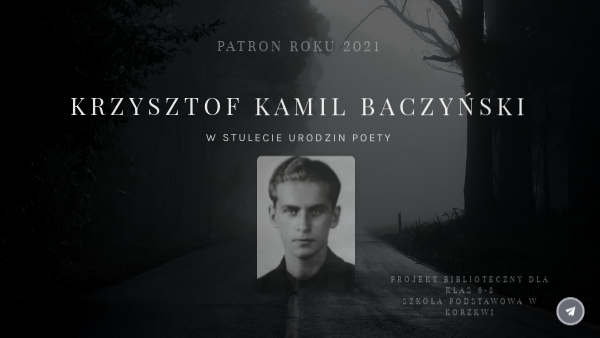 zachęcam was do zapoznania się z życiem i twórczością krzysztofa kamila baczyńskiego. przeglądajcie kolejne slajdy tej prezentacji zapamiętując informacje o autorze. możece obejrzeć film, posłuchać utworów do tekstów jego wierszy. wnikliwie czytajcie, przy każdym slajdzie znajduje się wskazówka, co należy zapamiętać. na końcu sprawdźcie swoją wiedzę w teleturnieju, który jest konkursem szkolnym.to piękna biografia i wspaniała dawka poezji, warto się w niej rozsmakować. zarezerwujcie sobie około 1,5 godziny czasu. zapraszam!