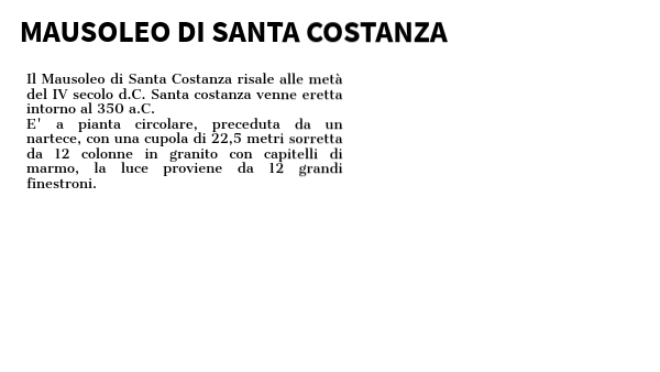 Il Mausoleo di Santa Costanza risale alle metà del IV secolo d.C. Santa costanza venne eretta intorno al 350 a.C.E' a pianta circolare, preceduta da un nartece, con una cupola di 22,5 metri sorretta da 12 colonne in granito con capitelli di marmo, la luce proviene da 12 grandi finestroni.