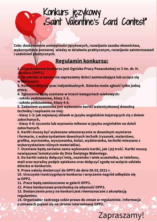 1. Organizatorem konkursu jest Ognisko Pracy Pozaszkolnej nr 2 im. dr. H. Jordana (OPP2).2. Do udziału w konkursie zapraszamy dzieci zamieszkujące lub uczące się w Warszawie.3. Konkurs dotyczy prac indywidualnych. Dziecko może zgłosić tylko jedną pracę.4. Zgłoszenia będą oceniane w trzech kategoriach wiekowych:- szkoła podstawowa, klasy 1-3, - szkoła podstawowa, klasy 4-6.5. Zadaniem uczestnika jest wykonanie kartki walentynkowej dowolną techniką i napisanie na niej:- klasy 1-3: jak najwięcej słówek w języku angielskim kojarzących się z dniem zakochanych,- klasy 4-6: życzenia lub wyznania miłosne w języku angielskim na dzień zakochanych.6. Kartki muszą być wykonane własnoręcznie w dowolnym wymiarze i formacie, z wykorzystaniem dowolnych technik (rysunek, malarstwo, grafika, wycinanka, wyszywanka, kolaż, wydzieranka, techniki mieszane z wykorzystaniem różnych materiałów). 7. Oceniane będą zarówno samo wykonanie kartki, jak i jej treść. Kartki muszą nawiązywać tematycznie do Dnia Świętego Walentego.8. Do kartki należy dołączyć imię, nazwisko i wiek uczestnika, nr telefonu, mail oraz wyraźny podpis opiekuna oraz dołączyć zgodę na wzięcie udziału dziecka w konkursie.9. Prace należy dostarczyć do OPP2 do dnia 08.02.2021 r. 10. Uroczyste rozstrzygnięcie konkursu i wręczenie nagród odbędzie się w OPP2. 11. Prace będą zamieszczone w galerii OPP2. 12. Prace konkursowe przechodzą na własność OPP2.13. Dostarczenie pracy na konkurs jest równoznaczne z akceptacją regulaminu.14. Organizator zastrzega sobie prawo do zmian w regulaminie. Informacja o zmianach pojawi się na stronie internetowej OPP2.