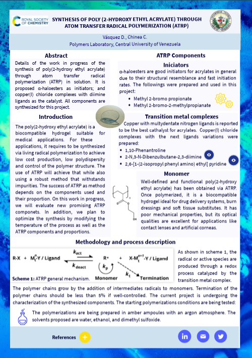 Details of the current work in progress of the synthesis of poly(2-hydroxy ethyl acrylate) through ATRP in solution. The componets proposed are α-haloesters as initiators and copper(I) chloride complexes with diimine ligands. All the components were synthesized for this project.