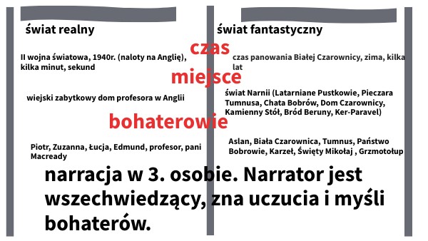 świat Narnii (Latarniane Pustkowie, Pieczara Tumnusa, Chata Bobrów, Dom Czarownicy, Kamienny Stół, Bród Beruny, Ker-Paravel)
