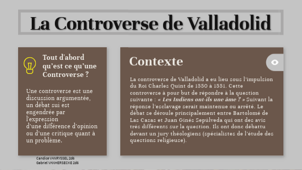La controverse de Valladolid a eu lieu sous l’impulsion du Roi Charles Quint de 1550 à 1551. Cette controverse à pour but de répondre à la question suivante : « Les Indiens ont-ils une âme ? » Suivant la réponse l’esclavage serait maintenue ou arrêté. Le débat se déroule principalement entre Bartolomé de Las Casas et Juan Ginés Sepúlveda qui ont des avis trés différents sur la question. Ils ont donc débattu devant un jury théologiens (spécialistes de l’étude des questions religieuse).