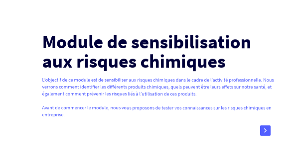 L’objectif de ce module est de sensibiliser aux risques chimiques dans le cadre de l’activité professionnelle. Nous verrons comment identifier les différents produits chimiques, quels peuvent être leurs effets sur notre santé, et également comment prévenir les risques liés à l’utilisation de ces produits. Avant de commencer le module, nous vous proposons de tester vos connaissances sur les risques chimiques en entreprise.