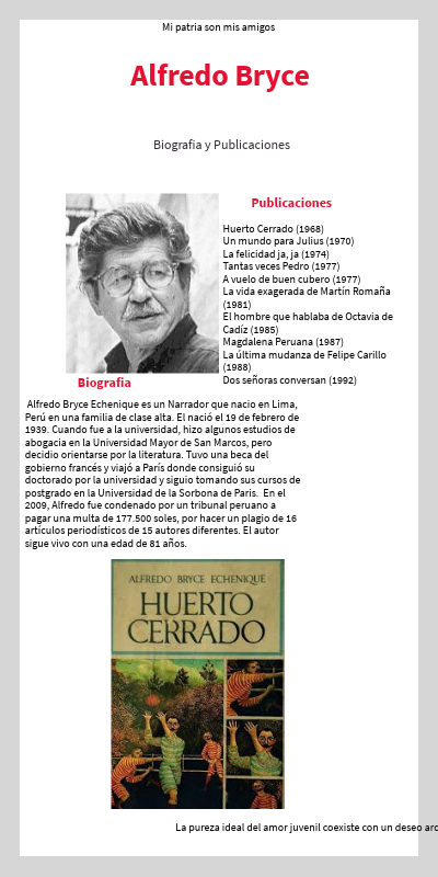 Alfredo Bryce Echenique es un Narrador que nacio en Lima, Perú en una familia de clase alta. El nació el 19 de febrero de 1939. Cuando fue a la universidad, hizo algunos estudios de abogacia en la Universidad Mayor de San Marcos, pero decidio orientarse por la literatura. Tuvo una beca del gobierno francés y viajó a París donde consiguió su doctorado por la universidad y siguio tomando sus cursos de postgrado en la Universidad de la Sorbona de Paris. En el 2009, Alfredo fue condenado por un tribunal peruano a pagar una multa de 177.500 soles, por hacer un plagio de 16 artículos periodísticos de 15 autores diferentes. El autor sigue vivo con una edad de 81 años.