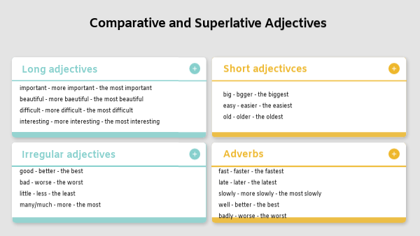 fast - faster - the fastest late - later - the latest slowly - more slowly - the most slowly well - better - the best badly - worse - the worst