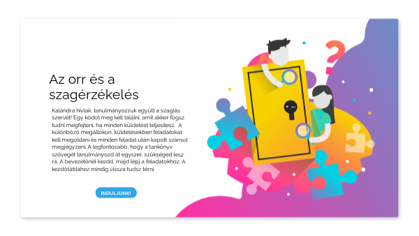 Kalandra hívlak, tanulmányozzuk együtt a szaglás szervét! Egy kódot meg kell találni, amit akkor fogsz tudni megfejteni, ha minden küldetést teljesítesz. A különbőző megállókon, küldetésekben feladatokat kell megoldani és minden feladat után kapott számot megjegyzeni. A legfontosabb, hogy a tankönyv szövegét tanulmányozd át egyszer, szükséged lesz rá. A bevezetőnél kezdd, majd lépj a feladatokhoz. A kezdőtáblához mindig vissza tudsz térni.