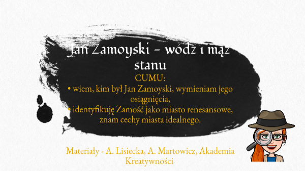 CUMU: • wiem, kim był Jan Zamoyski, wymieniam jego osiągnięcia, • identyfikuję Zamość jako miasto renesansowe, znam cechy miasta idealnego. Materiały - A. Lisiecka, A. Martowicz, Akademia Kreatywności