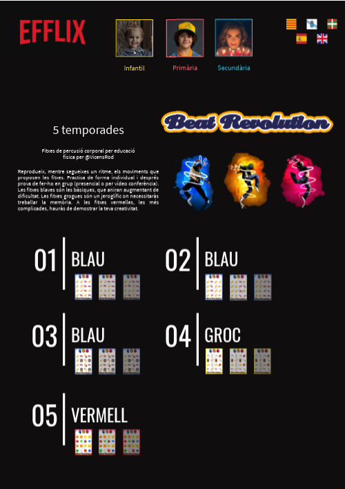 Reprodueix, mentre segueixes un ritme, els moviments que proposen les fitxes. Practica de forma individual i després prova de fer-ho en grup (presencial o per vídeo conferència). Les fitxes blaves són les bàsiques, que aniran augmentant de dificultat. Les fitxes grogues són un jeroglífic on necessitaràs treballar la memòria. A les fitxes vermelles, les més complicades, hauràs de demostrar la teva creativitat.