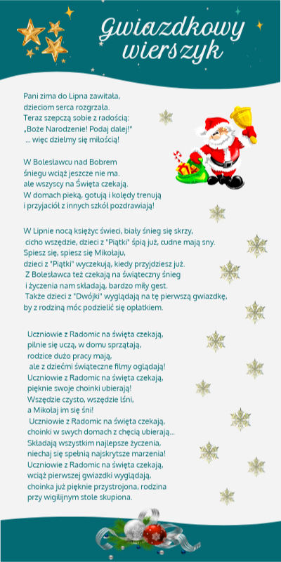 Uczniowie z Radomic na święta czekają, pilnie się uczą, w domu sprzątają, rodzice dużo pracy mają, ale z dziećmi świąteczne filmy oglądają! Uczniowie z Radomic na święta czekają, pięknie swoje choinki ubierają! Wszędzie czysto, wszędzie lśni, a Mikołaj im się śni! Uczniowie z Radomic na święta czekają, choinki w swych domach z chęcią ubierają... Składają wszystkim najlepsze życzenia, niechaj się spełnią najskrytsze marzenia! Uczniowie z Radomic na święta czekają, wciąż pierwszej gwiazdki wyglądają, choinka już pięknie przystrojona, rodzina przy wigilijnym stole skupiona.