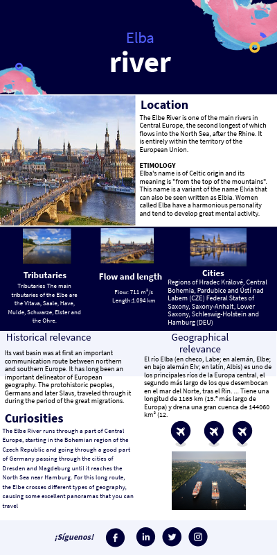 The Elbe River is one of the main rivers in Central Europe, the second longest of which flows into the North Sea, after the Rhine. It is entirely within the territory of the European Union. ETIMOLOGY Elba's name is of Celtic origin and its meaning is "from the top of the mountains". This name is a variant of the name Elvia that can also be seen written as Elbia. Women called Elba have a harmonious personality and tend to develop great mental activity.