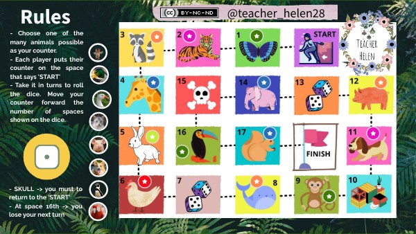 - Choose one of the many animals possible as your counter. - Each player puts their counter on the space that says 'START' - Take it in turns to roll the dice. Move your counter forward the number of spaces shown on the dice.