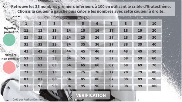 Retrouve les 25 nombres premiers inférieurs à 100 en utilisant le crible d'Eratosthène. Choisis la couleur à gauche puis colorie les nombres avec cette couleur à droite.