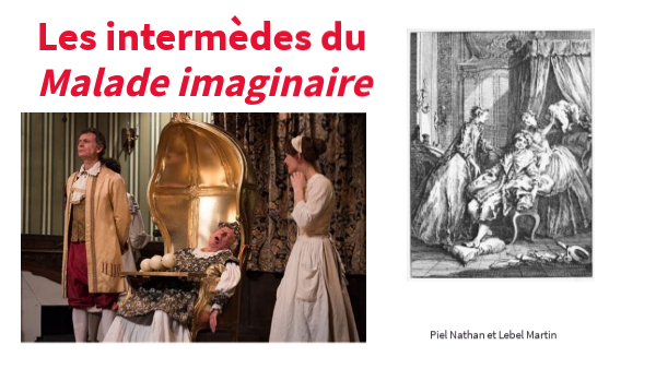 Malade imaginaire= comédie balletGenre créé par Molière et Lully Pïèce de théâtre doté d'intermèdes à la fin de chaque acte où danseurs et chanteurs montent sur scène divertissant les spectateurs et laissant le temps aux acteurs de se changer