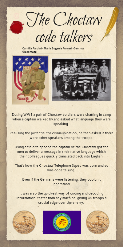 During WW1 a pair of Choctaw soldiers were chatting in camp when a captain walked by and asked what language they were speaking. Realising the potential for communication, he then asked if there were other speakers among the troops.
