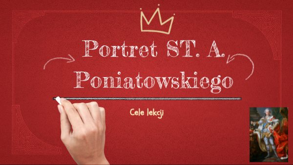 Portret Stanisława Augusta Poniatowskiego w stroju koronacyjnym namalowany został przez ... .Król na ramionach ma .... obszyty futrem z gronostaja. Na szyi znajduje się ...... . Król w prawej ręce trzyma .... . Insygnia królewskie, czyli ....., ..... leżą na .... . Król stoi obok okazałego .... .