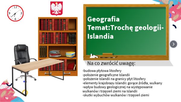 -budowa płytowa litosfery-położenie geograficzne Islandii -położenie Islandii na granicy płyt litosfery -elementy krajobrazu Islandii: gorące źródła, wulkany -wpływ budowy geologicznej na występowanie wulkanów i trzęsień ziemi na Islandii -skutki wybuchów wulkanów i trzęsień ziemi