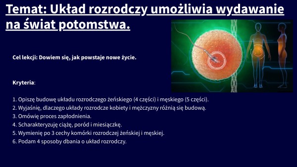 Cel lekcji: Dowiem się, jak powstaje nowe życie. Kryteria: 1. Opiszę budowę układu rozrodczego żeńskiego (4 części) i męskiego (5 części). 2. Wyjaśnię, dlaczego układy rozrodcze kobiety i mężczyzny różnią się budową. 3. Omówię proces zapłodnienia. 4. Scharakteryzuję ciążę, poród i miesiączkę. 5. Wymienię po 3 cechy komórki rozrodczej żeńskiej i męskiej. 6. Podam 4 sposoby dbania o układ rozrodczy.