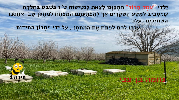 יַלְדֵי "עֵמֶק חָרוֹד" הִתְכַּוְּנוּ לָצֵאת לִנְטִיעוֹת ט"ו בִּשְׁבָט בְּחֶלְקָהּ שֶׁמִּסָּבִיב לְמַטַּע הַשְּׁקֵדִים אַךְ לְהַפְתָּעָתָם הַמַּפְתֵּחַ לַמַּחְסָן שֶׁבּוֹ אֻחְסְנוּ הַשְּׁתִילִים נֶעֱלַם. עִזְרוּ לָהֶם לִפְתֹּחַ אֶת הַמַּחְסָן , עַל יְדֵי פִּתְרוֹן החִידוֹת.