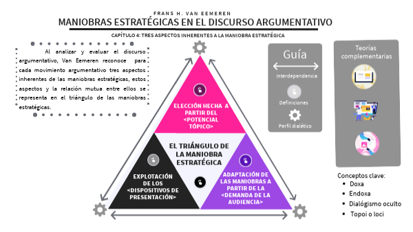 Al analizar y evaluar el discurso argumentativo, Van Eemeren reconoce para cada movimiento argumentativo tres aspectos inherentes de las maniobras estratégicas, estos aspectos y la relación mutua entre ellos se representa en el triángulo de las maniobras estratégicas.
