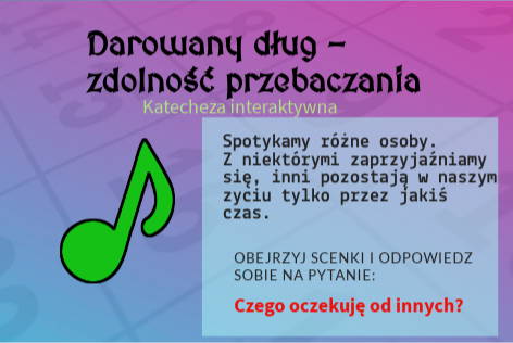 Zastanów się...– Jak zachowujesz się względem osoby, która cię w jakiś sposób skrzywdziła? – Czy jest ktoś, komu nie podajesz ręki i unikasz go? – W jaki sposób możesz modlić się, gdy masz trudności z przebaczeniem drugiej osobie? – Dlaczego warto modlić się za osobę, która cię zraniła?
