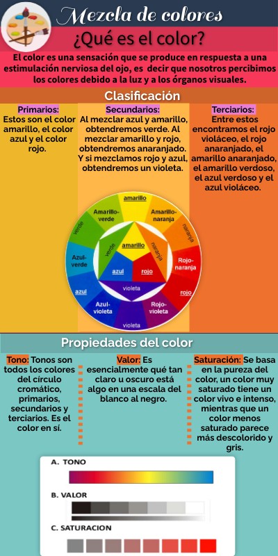 Secundarios: Al mezclar azul y amarillo, obtendremos verde. Al mezclar amarillo y rojo, obtendremos anaranjado. Y si mezclamos rojo y azul, obtendremos un violeta.