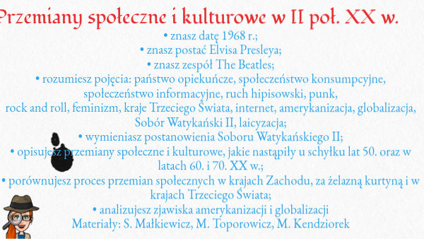 • znasz datę 1968 r.; • znasz postać Elvisa Presleya; • znasz zespół The Beatles; • rozumiesz pojęcia: państwo opiekuńcze, społeczeństwo konsumpcyjne, społeczeństwo informacyjne, ruch hipisowski, punk, rock and roll, feminizm, kraje Trzeciego Świata, internet, amerykanizacja, globalizacja, Sobór Watykański II, laicyzacja; • wymieniasz postanowienia Soboru Watykańskiego II; • opisujesz przemiany społeczne i kulturowe, jakie nastąpiły u schyłku lat 50. oraz w latach 60. i 70. XX w.; • porównujesz proces przemian społecznych w krajach Zachodu, za żelazną kurtyną i w krajach Trzeciego Świata; • analizujesz zjawiska amerykanizacji i globalizacji Materiały: S. Małkiewicz, M. Toporowicz, M. Kendziorek Materiały - Historia w szkole