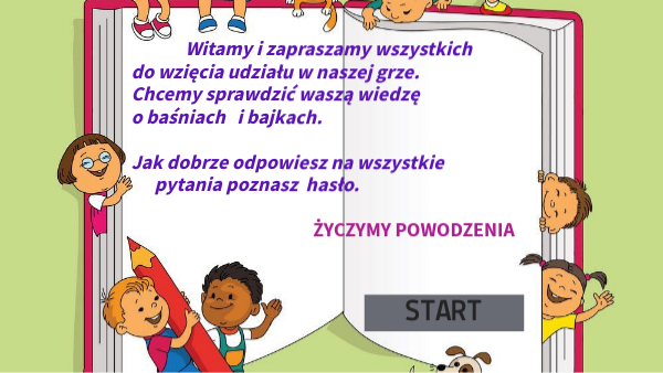 Witamy i zapraszamy wszystkich do wzięcia udziału w naszej grze. Chcemy sprawdzić waszą wiedzę o baśniach i bajkach. Jak dobrze odpowiesz na wszystkie pytania poznasz hasło. ŻYCZYMY POWODZENIA
