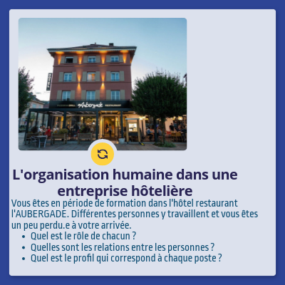 Vous êtes en période de formation dans l'hôtel restaurant l'AUBERGADE. Différentes personnes y travaillent et vous êtes un peu perdu.e à votre arrivée.