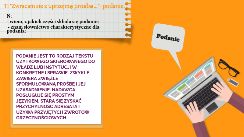 N: - wiem, z jakich części składa się podanie; - znam słownictwo charakterystyczne dla podania;