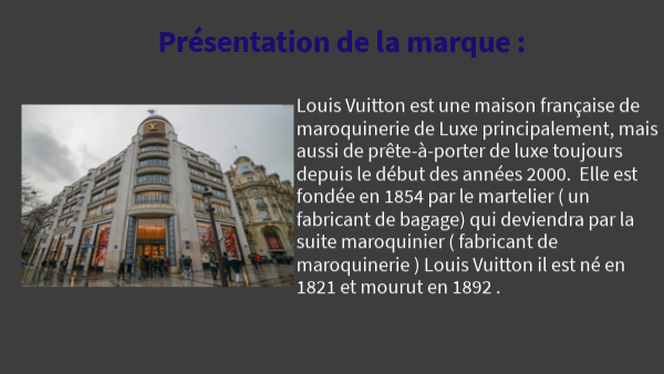 Louis Vuitton est une maison française de maroquinerie de Luxe principalement, mais aussi de prête-à-porter de luxe toujours depuis le début des années 2000. Elle est fondée en 1854 par le martelier ( un fabricant de bagage) qui deviendra par la suite maroquinier ( fabricant de maroquinerie ) Louis Vuitton il est né en 1821 et mourut en 1892 .