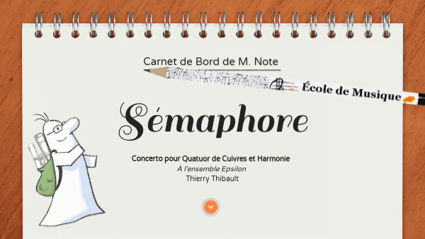 Mesdames et Messieurs, bienvenue dans mon tout premier Carnet de Bord ! Dans ce carnet, je vais vous raconter ma rencontre avec le morceau Sémaphore de Thierry Thilbault. Ce morceau est une commande de l'Orchestre d'Harmonie de Cébazat et a été créé en 2003, au Sémaphore, avec l'ensemble Epsilon lors du festival "Cocktail de Cuivres". Installez-vous confortablement, servez-vous quelque chose à boire et prenez place à bord de ce voyage hors du temps.