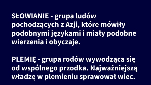 SŁOWIANIE - grupa ludów pochodzących z Azji, które mówiły podobnymi językami i miały podobne wierzenia i obyczaje. PLEMIĘ - grupa rodów wywodząca się od wspólnego przodka. Najważniejszą władzę w plemieniu sprawował wiec.