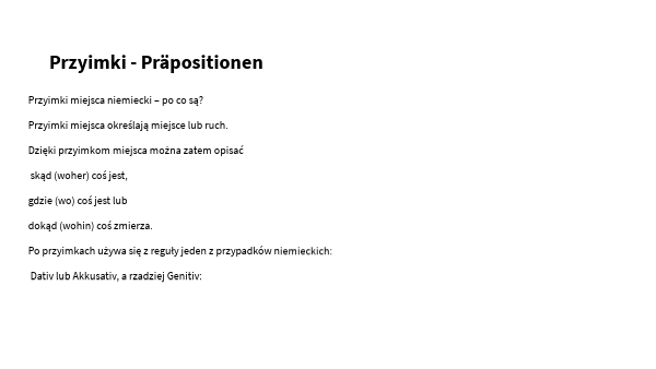 Przyimki miejsca niemiecki – po co są? Przyimki miejsca określają miejsce lub ruch. Dzięki przyimkom miejsca można zatem opisać skąd (woher) coś jest, gdzie (wo) coś jest lub dokąd (wohin) coś zmierza. Po przyimkach używa się z reguły jeden z przypadków niemieckich: Dativ lub Akkusativ, a rzadziej Genitiv: