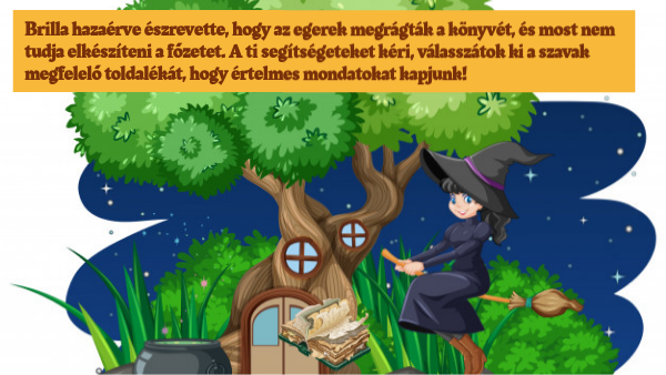 Brilla hazaérve észrevette, hogy az egerek megrágták a könyvét, és most nem tudja elkészíteni a főzetet. A ti segítségeteket kéri, válasszátok ki a szavak megfelelő toldalékát, hogy értelmes mondatokat kapjunk!