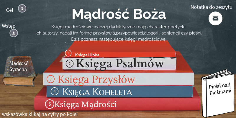 Księgi mądrościowe inaczej dydaktyczne mają charakter poetycki. Ich autorzy, nadali im formę przysłowia,przypowieści,alegorii, sentencji czy pieśni. Dziś poznasz następujące księgi mądrościowe: