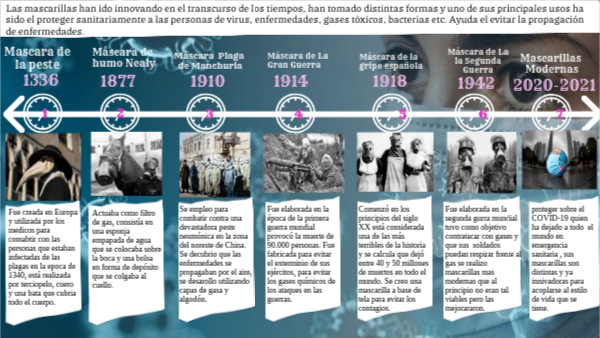 Las mascarillas han ido innovando en el transcurso de los tiempos, han tomado distintas formas y uno de sus principales usos ha sido el proteger sanitariamente a las personas de virus, enfermedades, gases tóxicos, bacterias etc. Ayuda el evitar la propagación de enfermedades.