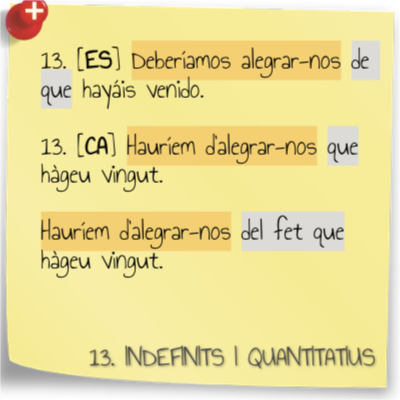 13. [ES] Deberíamos alegrar-nos de que hayáis venido. 13. [CA] Hauríem d’alegrar-nos que hàgeu vingut. Hauríem d’alegrar-nos del fet que hàgeu vingut.