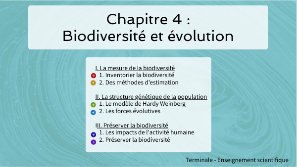I. La mesure de la biodiversité 1. Inventorier la biodiversité 2. Des méthodes d'estimation II. La structure génétique de la population 1. Le modèle de Hardy Weinberg 2. Les forces évolutives III. Préserver la biodiversité 1. Les impacts de l'activité humaine 2. Préserver la biodiversité