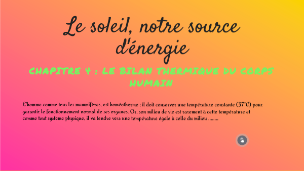 L'homme comme tous les mammifères, est homéotherme : il doit conserver une température constante (37°C) pour garantir le fonctionnement normal de ses organes. Or, son milieu de vie est rarement à cette température et comme tout système physique, il va tendre vers une température égale à celle du milieu ........