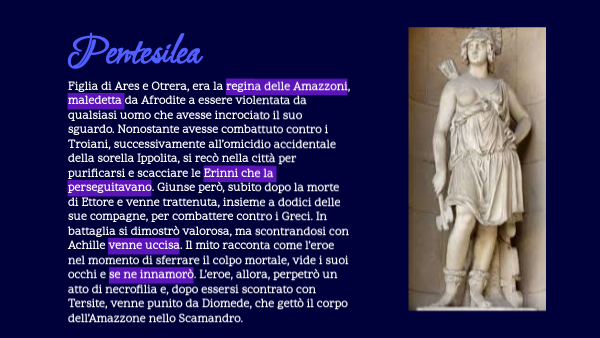Figlia di Ares e Otrera, era la regina delle Amazzoni, maledetta da Afrodite a essere violentata da qualsiasi uomo che avesse incrociato il suo sguardo. Nonostante avesse combattuto contro i Troiani, successivamente all’omicidio accidentale della sorella Ippolita, si recò nella città per purificarsi e scacciare le Erinni che la perseguitavano. Giunse però, subito dopo la morte di Ettore e venne trattenuta, insieme a dodici delle sue compagne, per combattere contro i Greci. In battaglia si dimostrò valorosa, ma scontrandosi con Achille venne uccisa. Il mito racconta come l’eroe nel momento di sferrare il colpo mortale, vide i suoi occhi e se ne innamorò. L’eroe, allora, perpetrò un atto di necrofilia e, dopo essersi scontrato con Tersite, venne punito da Diomede, che gettò il corpo dell’Amazzone nello Scamandro.